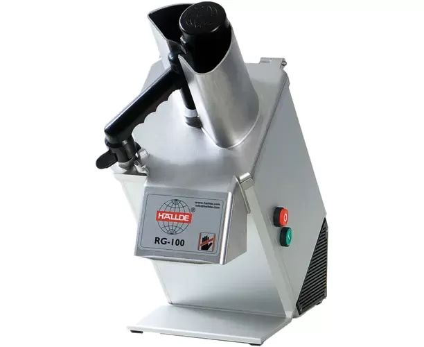 Hallde RG-100 is a versatile and high-capacity vegetable preparation machine designed for commercial kitchens. It efficiently slices, dices, shreds, grates, and makes julienne and crimping slices in various dimensions. With a robust, all-metal construction and a powerful 250W motor, it can process up to 400 portions per day or 5 kg per minute. Its ergonomic design and easy-to-clean features make it ideal for small to medium-sized kitchens in restaurants, cafés, catering services, and more.